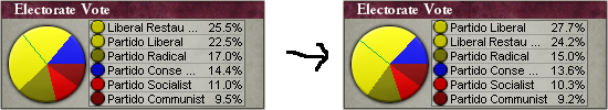 上院は保守主義者100%となりました。そして、下院の議席配分は、国粋主義党が19.2%、保守党が15.8%、国民党が15.2%、急進党が10.3%、共産党が10.2%、社会党が8.1%、自由主義新党の自由民主派が7.5%、自由党が6.9%、自由連合が6.6%なっています。国粋主義党・保守党・国民党の3党連合で36.5%、保守・反動勢力で60.2%を占めています。社会党・共産党の連合は18.3%で、低落傾向が止まらない模様です。自由主義勢力は、新党の自由民主派の出現で分裂しました。