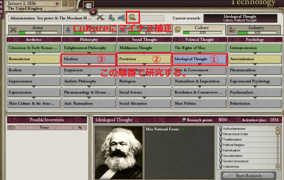 1840年になると研究点を上昇させるIdealismが研究可能になるため、それまで研究点を貯めて、これを研究する。