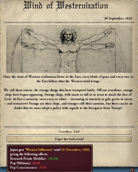 まず、列強に入る以前に、さまざまな改革を行い、文明化進展度(Civilization Progress)を100%にして、西洋化(Westernize)する必要があります。