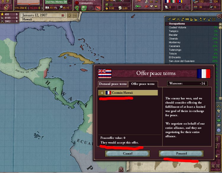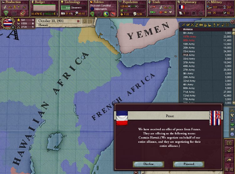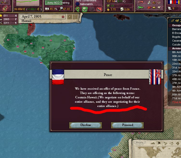 しかし、カエル野郎もここまでハワイが強固に和平を飲まないとは思わなかったであろう。和平とは結びたい方が下手に出ねばならぬもの。みよ、このフランスの間抜けな要求を!!