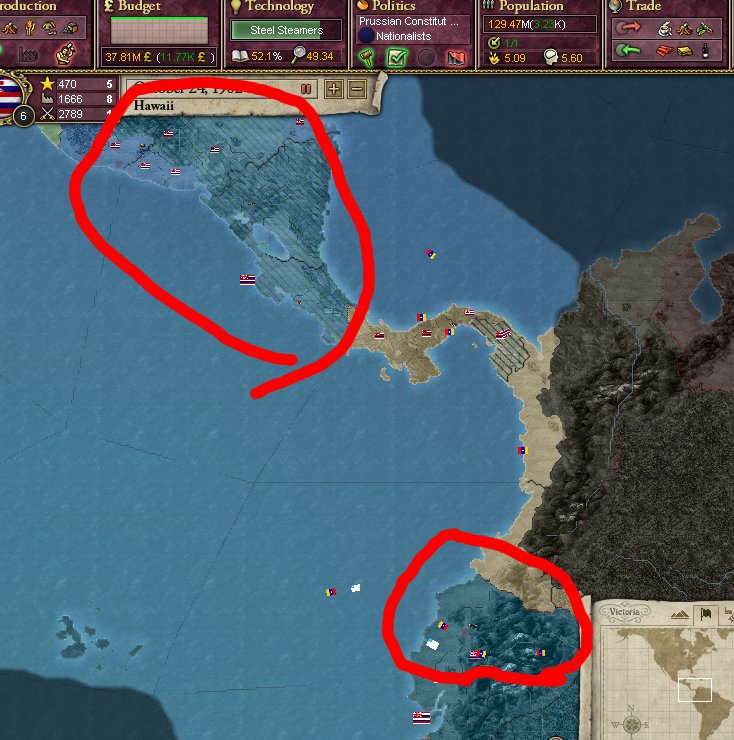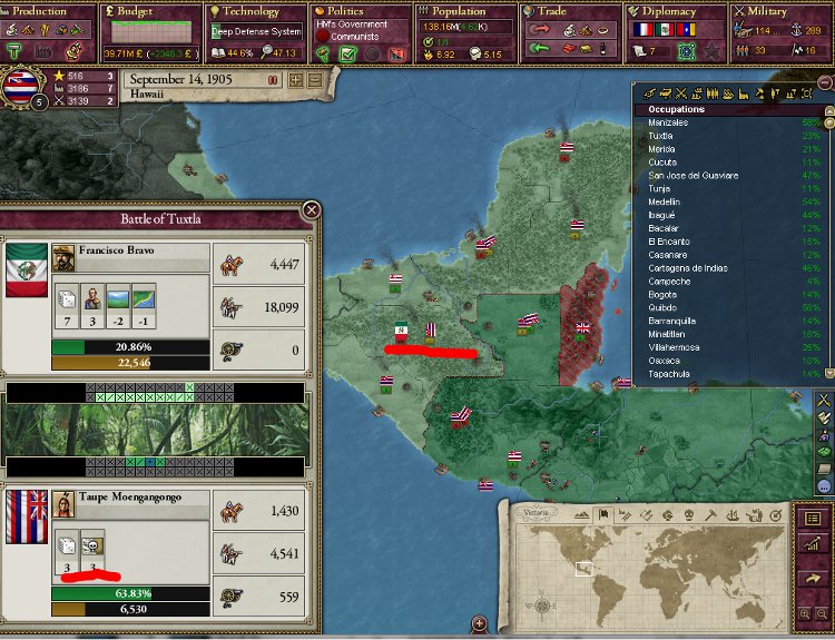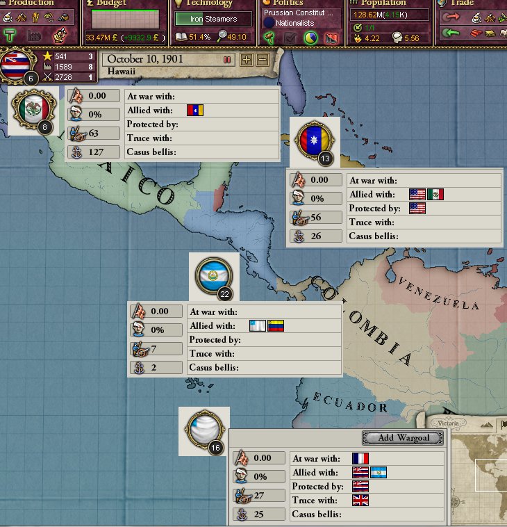 ええい、コロンビアごとき何とでもなるであろう。先にコロンビア占領してたら中央アメリカ連邦のパナマをUSAに取られた(=USAまで陸続きじゃなくなった)ので、急がねばなるまい。コロンビア領土はスルーして中央アメリカ連邦にも宣戦!!