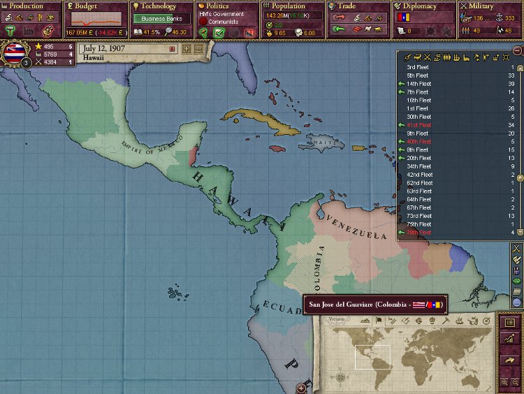 そのコロンビアはと言うと、アメリカ・メキシコと同盟中ですね。宣戦するなら中央アメリカに宣戦した方が米・メキシコが釣られなくていいんですが、それ以前にコロンビア海軍26隻を相手して上陸作戦は危険が伴います。