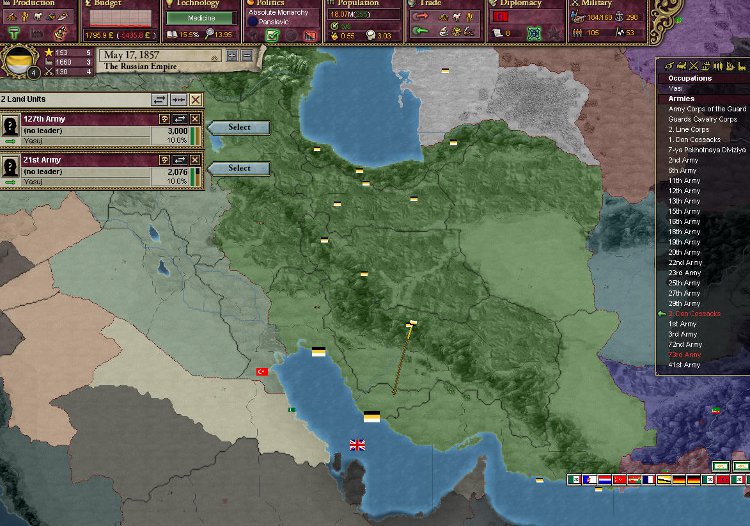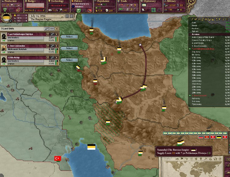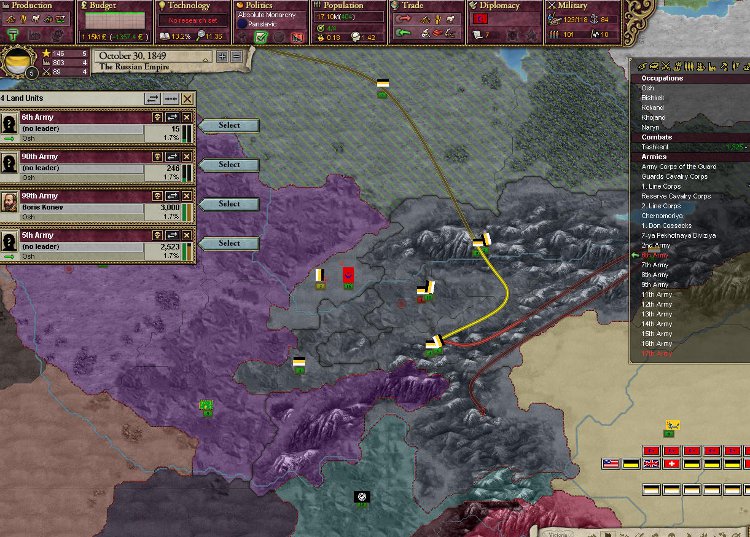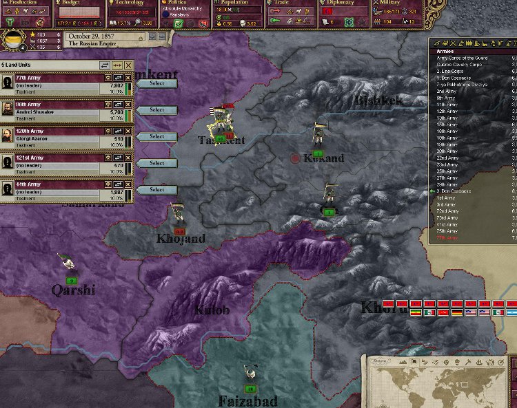 先週の続きのコーカンド戦からスタート。今、なぜこんな戦争をしているかというと、1950年のNationalism and Imprerialism解禁に合わせて一発併合できるように、余計なステートを削っておきたいから。コーカンドを取るとそもそも美味しいのかってツッコミはあるが……ここは権益が確定したので。