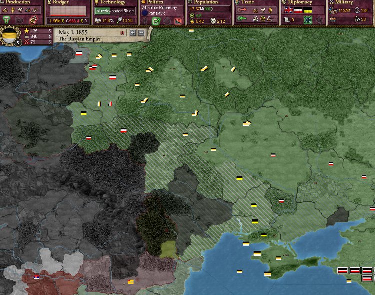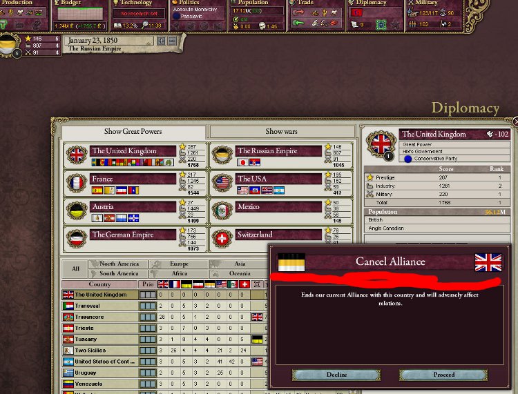 しかし、さあ開戦はあと1年くらい?という1852年ごろ、イギリスがフランスへのランダムCBゲットーと言い出した……マジかよおいおい。 しかし、ドイツ戦の間なら、「一切手出しをしない」という和平協定なので宣戦はしない筈。しかし、念のためということで、ランダムCBの期限が切れる1年間は待ってからドイツに宣戦することにした。
