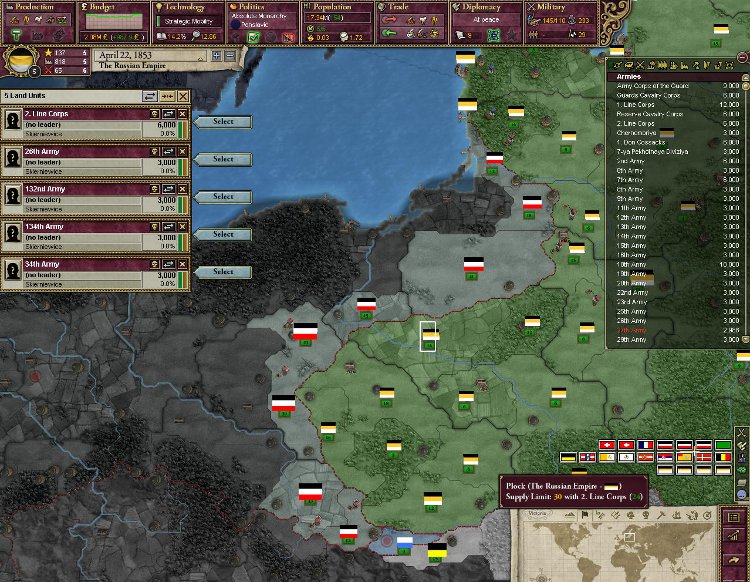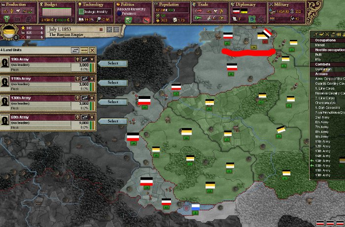 そして、運命の宣戦の時。1853年8月、フランス、ロシアがドイツ帝国に宣戦。オーストリアややっぱり参戦してきやがった……。しかし、とりあえず目先の敵はドイツなので、とりあえず突破を図っていく。