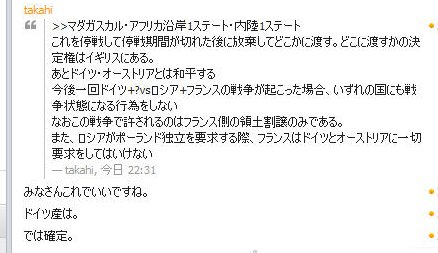 ここらへんで和平交渉に入る。交渉の詳しい経緯は忘れてしまったのだが、イギリスのフランスに対する条項が厳しい。アフリカの権益がガンガン剥奪していく……。フランスからアフリカがないなんて……ちょっと気の毒過ぎる和平になってき気がする。容赦ないぞイギリス。