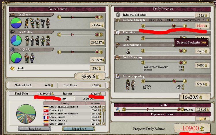 これは実は戦争の借金ではない。戦争の後に、海軍を発注したのが悪いのか、しかしそれにしても、一瞬でこの借金の膨れ上がり方は異常だ。国家備蓄の額が酷い……物資購入が悪いのか、工場の補助金のせいか!? 財政再建策を考えなきゃと思いつつ、今回はお開きとなった。