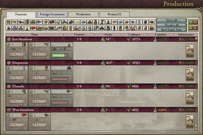 政権を工場建設可能な政党にしたため、電子部品工場や戦車工場、飛行機工場を設立する。