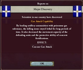 戦力という点でいえば、この時点でギリシャの陸軍技術は25/30で、オスマントルコの20/30を上回っているが、オーストリア=ハンガリーとは24/30でほとんど変わらないし、頼みの綱である毒ガスの技術を持っている可能性も高い。