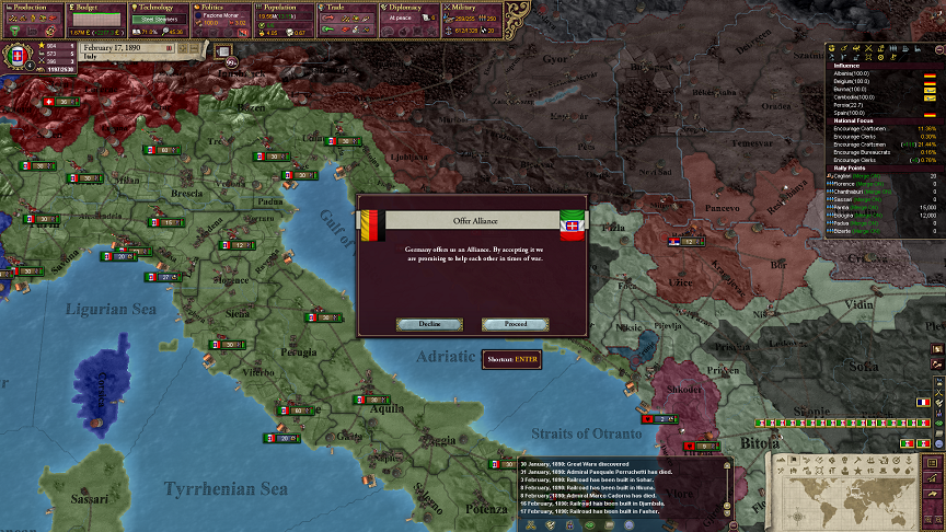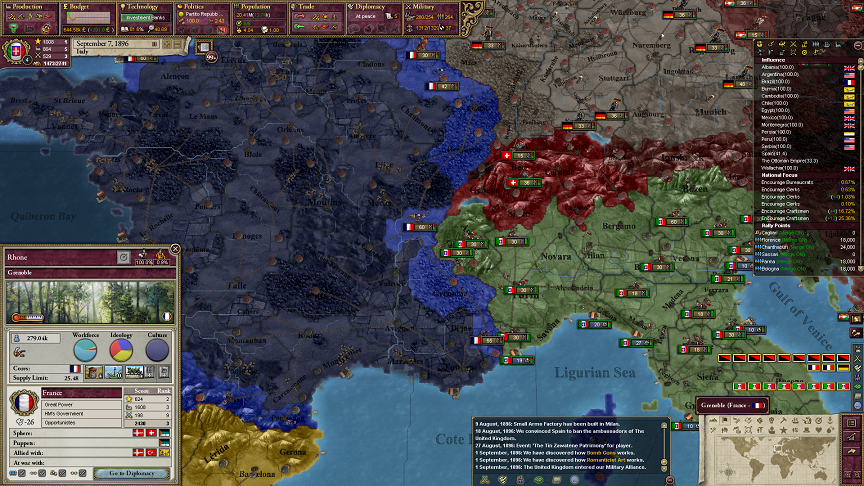 これで地中海でローマの勢力圏にないのは、イギリスのジブラルタル、マルタ、フランスの地中海沿岸州、黒海のロシア、アドリア海のオーストリアぐらいかな。ただ、ロシアは40年に渡る同盟国だからそれはいいかな。