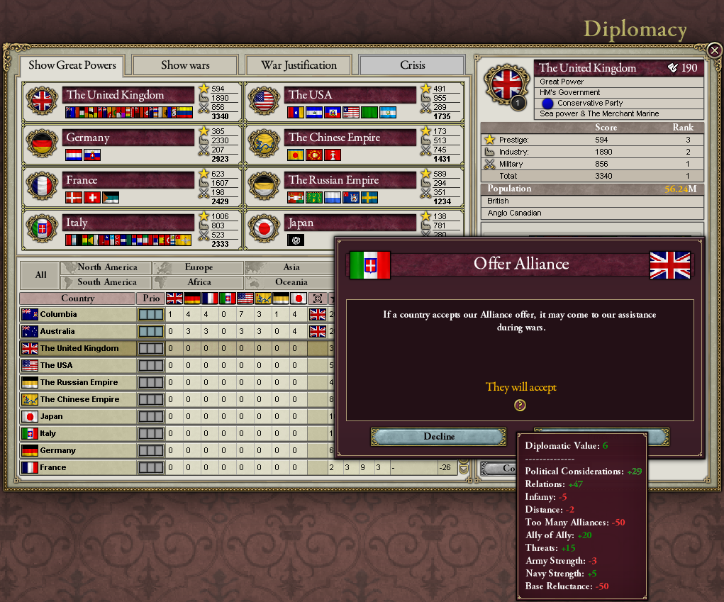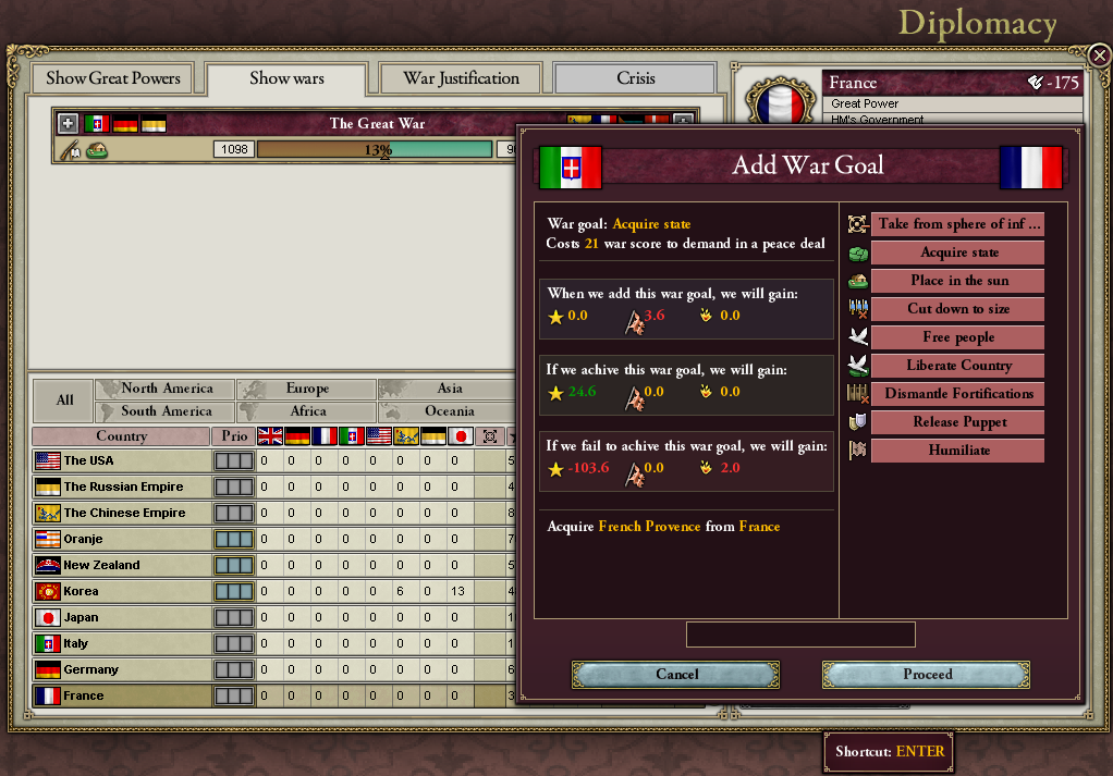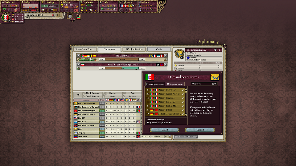 危機での大戦は、リーダー国が終戦での和平交渉権を得るんだ。だから、参戦国が膨大な要求をしても和平交渉で好きなように条件をどちらにも飲ませることができる。後から参加した国の発言権はかなり弱くなる。*2