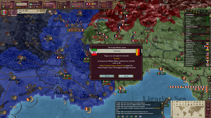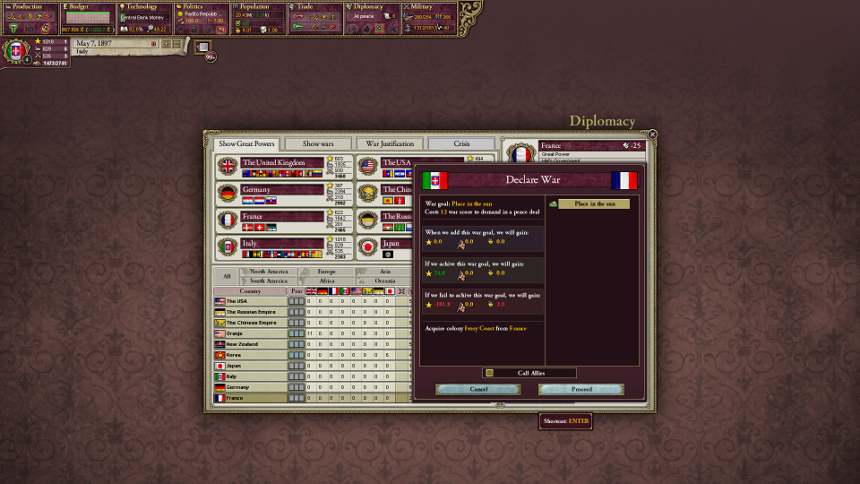 フランスに戦争を吹っかける。防御側の場合、AIは参戦を基本的に承諾する。そのうえで、イタリアがどこかの列強に参戦要請する。その列強が参戦する。どうなる?