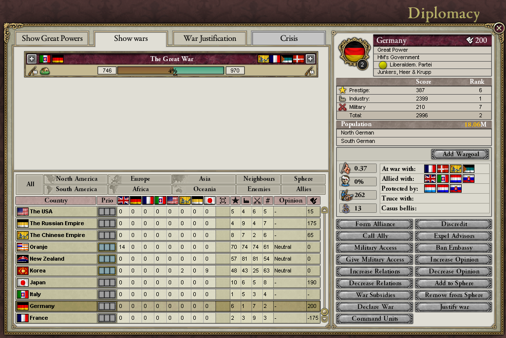 そだね。それだけじゃなくて。大戦時には通常なら大きいInfamyを受ける戦争目的の追加が、1/3のInfamyでできる。参戦国は大量のAddWarGoalを行うのが常だね。それこそ、敗北側が応じられないくらいの。*1