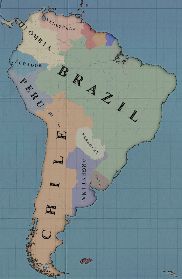 ボリビアは併合され、ペルーは北半分だけに。なんだかアルゼンチンがショボーン(´・ω・`)な状態になっていますね。