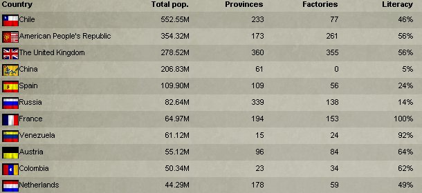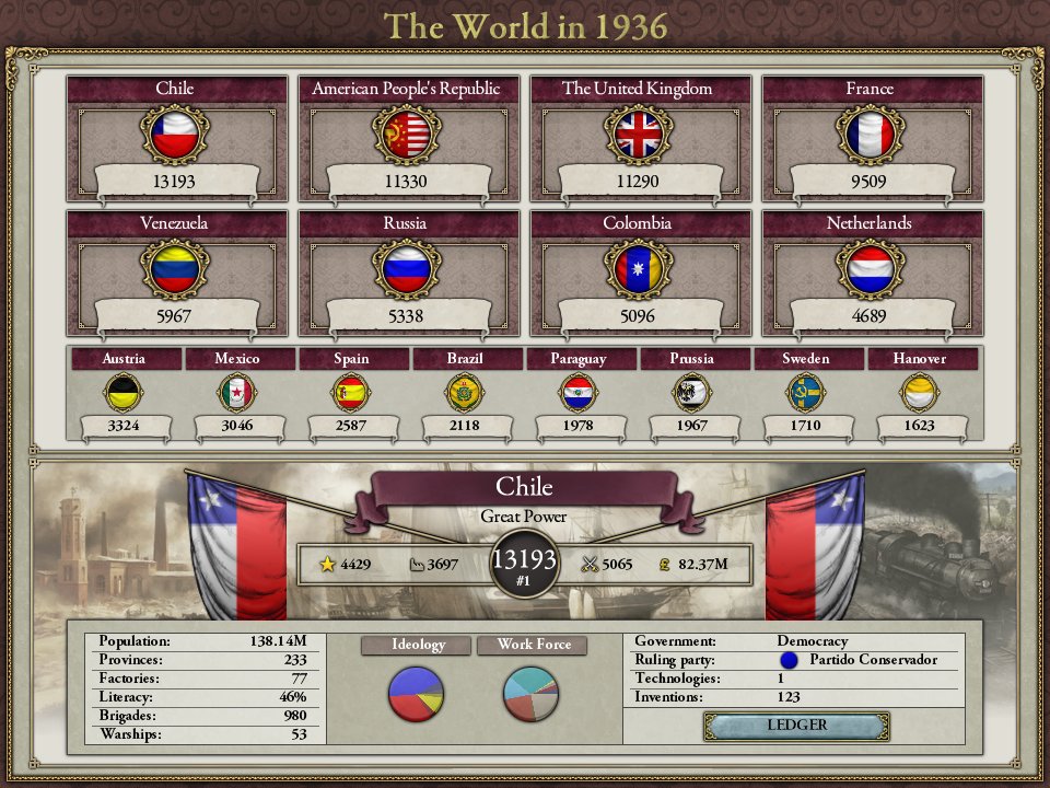 アメリカ人民共和国は我が国とベネズエラ以外は各列強との国際関係値がマイナスですね。ベネズエラもアメリカ人民共和国とオランダ以外は各列強との国際関係値がマイナスですね。
