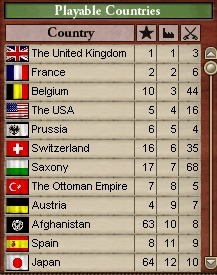 1位から順にUK、我がフランス、ロシア帝国、オーストリア、USA、プロイセン、オスマン帝国、スペイン、スウェーデン、ベルギーだな。