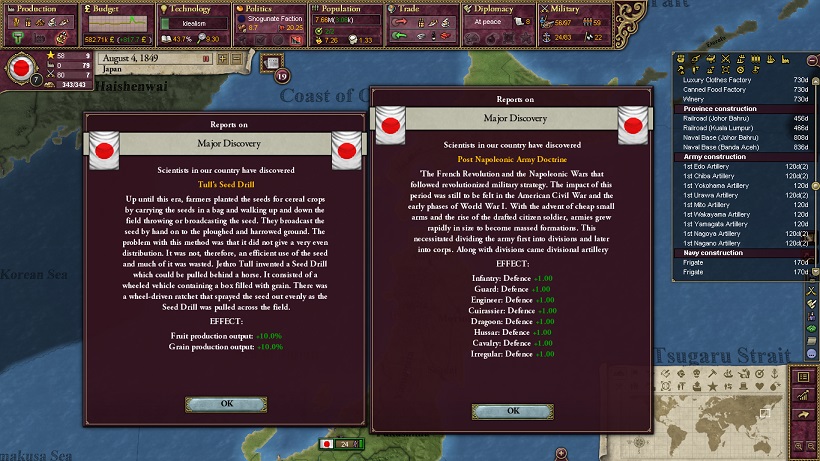 発明確率を増やすには、「(この技術の子技術である)マシンガンMachine Guns」(25%)、「(海軍の第4世代技術の)海軍兵站Naval Logistics」(25%)、「(経済の第5世代技術の)経営責任Economic Responsibility」(25%)、または、「列強8か国のいずれかがこの発明を成し遂げていること」(10%)*2、というボーナスがなければなりません。