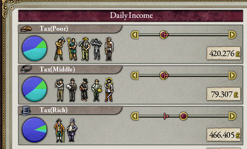 国民が豊かかどうかざっとみるには予算画面を参照。水色の連中が上のPOPにいきそうな金持ち連中だ。資本家の場合は活発に活動してくれる奴ら。