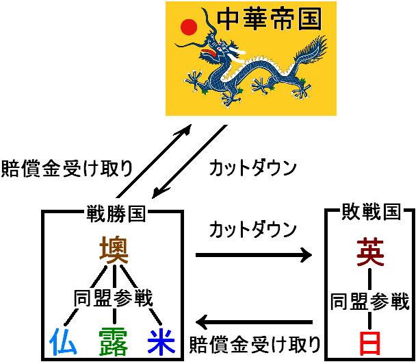 賠償金を含めた収入のうち50%を中華帝国へ賠償金を支払うという、中国が一人勝ちする意味の分からない構図になった・・・。