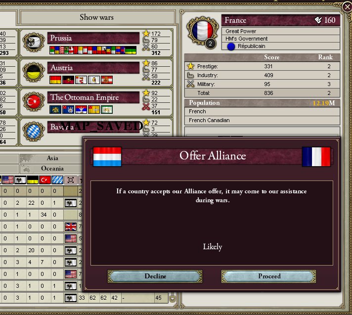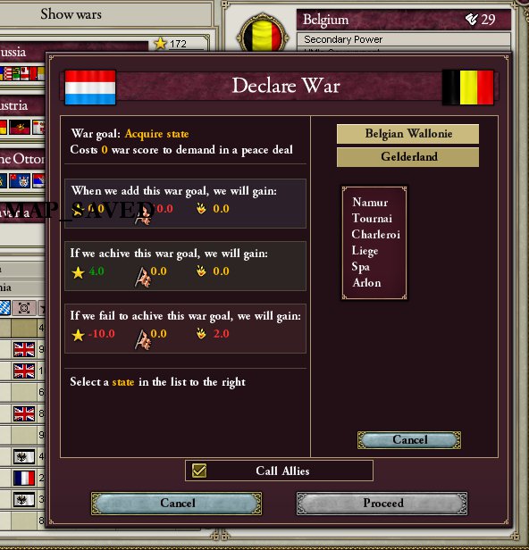 我が国のInfamiyは7.44、モデナをConquestしたら25以上ですから存続が危ぶまれる水準になります。そう考えると、Infamyの増加ナシで開戦でき、しかも直接陸続きの領土を得られるベルギーとの開戦の魅力は理解できます。しかし閣下。そうは言っても、同盟国は和平結んでる国との戦争には参戦してきませんよ。