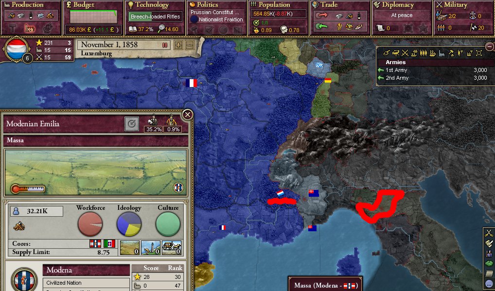 うむ。余の脳内シミュレーションではフランス、サルディーニャを通過してモデナに奇襲攻撃を仕掛けようと考えていたのだ。