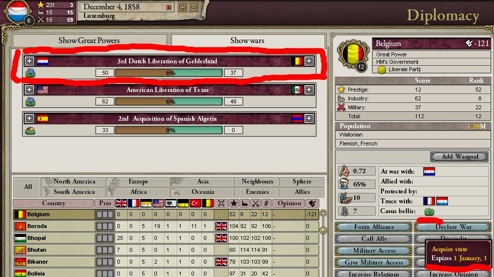 なんとベルギーとの間にAcquire StateのCBが付いてますね。しかも、良く見るとベルギーとオランダが戦争しています。我が国とベルギーは1862年8月までの和平が残っていますが……。