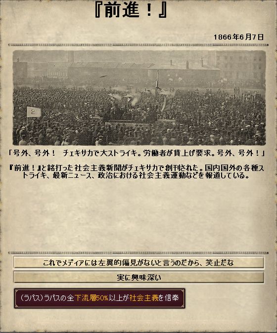 そして、ほとんどが下層階級のため、このイベント一発で国民の2,3割が社会主義になる。このあと、10年近く上院の過半数が社会主義者のため社会改革はすべて終了する。