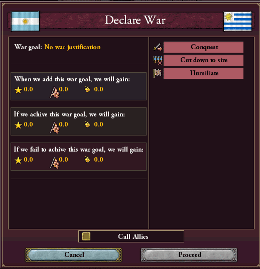 ウルグアイは1ステートの国家だから、今回はConquest(征服)を選択する