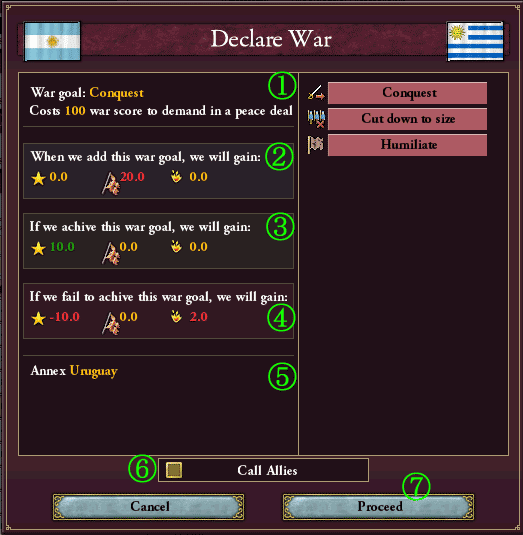 まず①に表示されているのがWar goal(戦争の目的)とそれを達成するために必要な勝利点だ