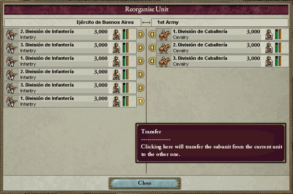 ここで分割したい師団を真ん中の矢印をクリックして右に移す、そして下の「Close」をクリックで完了だ