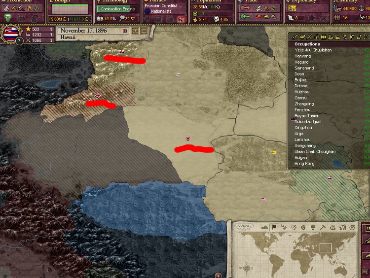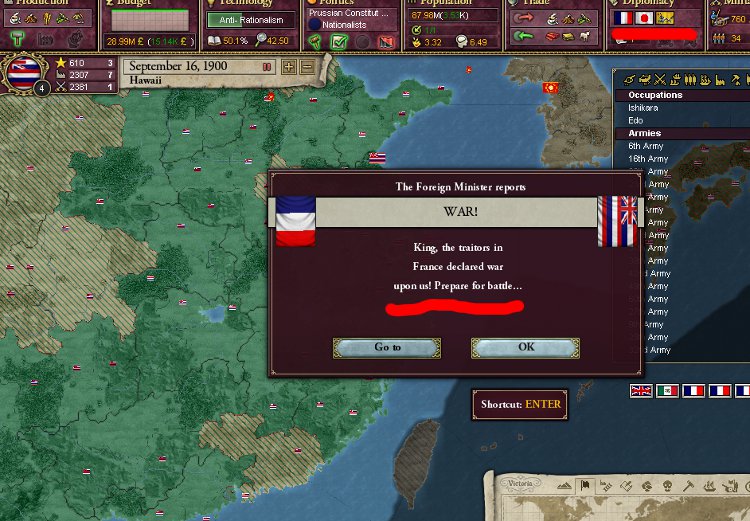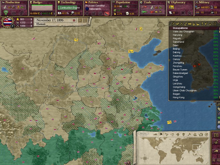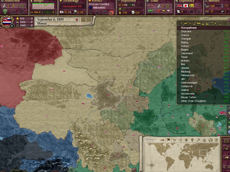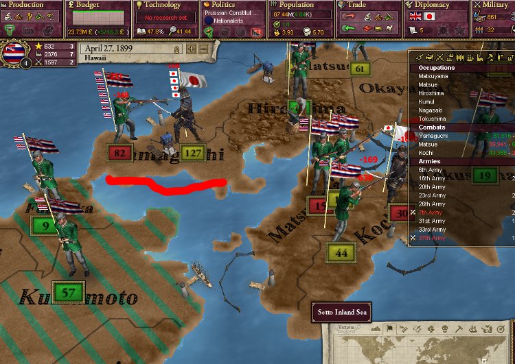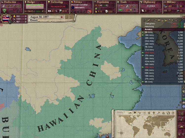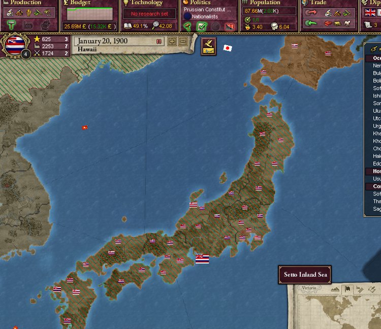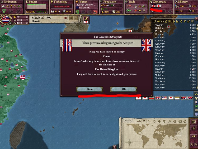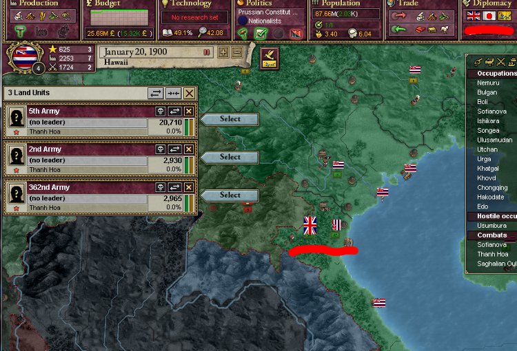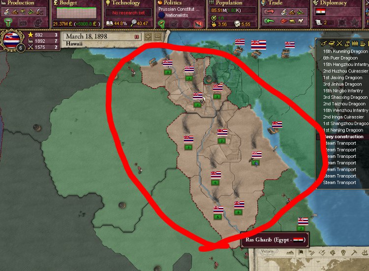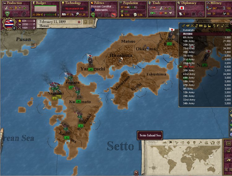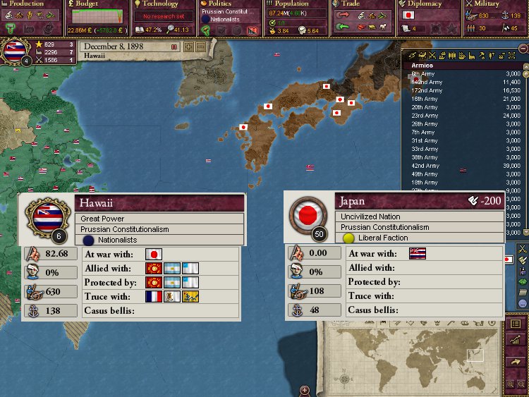 大王様、ご安心下さい。我が軍は着々と準備を進めております。これを見て下さい。陸軍は総勢540師団、輸送船は現在105隻まで増えております。ハワイは早期から蒸気船技術を導入しているので、贅沢にも蒸気輸送船で揃えております。20隻程度ですがCommerce raiderもいます。