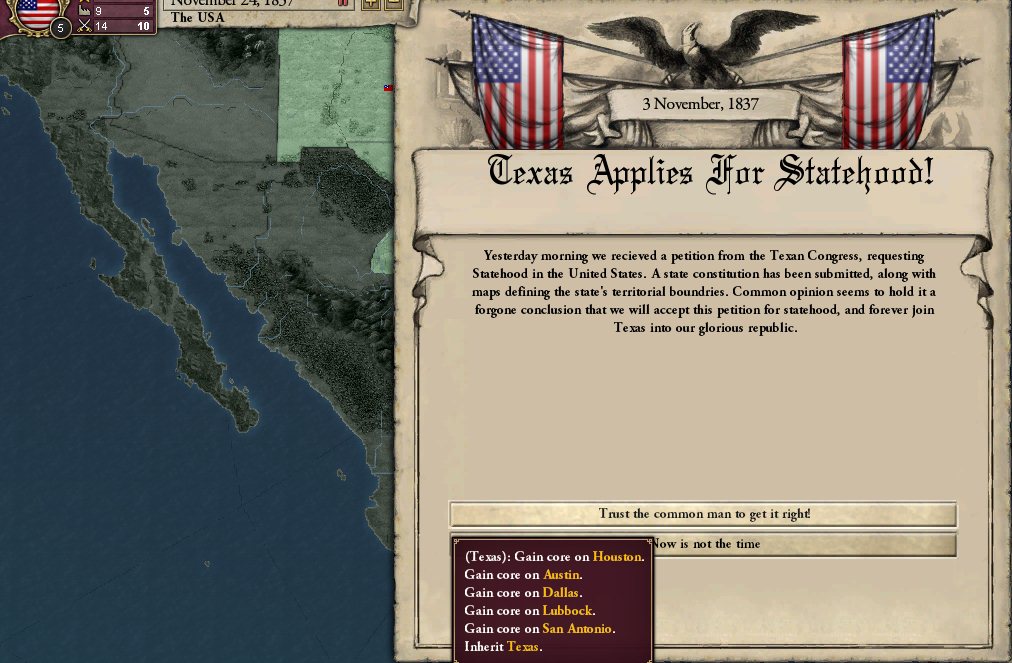 イベントが発生しテキサスは合衆国の一部になります。
