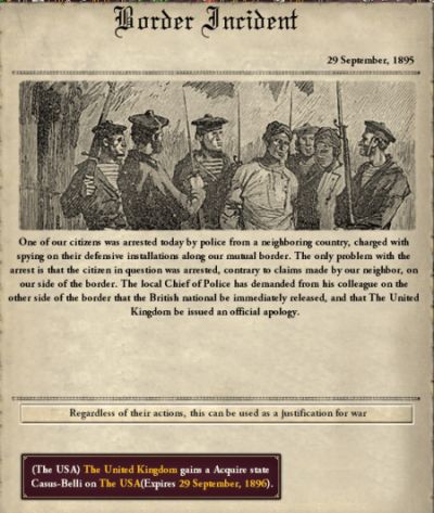友好度の悪い国相手に戦争の口実を作れるイベント。こんなのでイギリスにケンカをふっかけられてはたまったものではない。