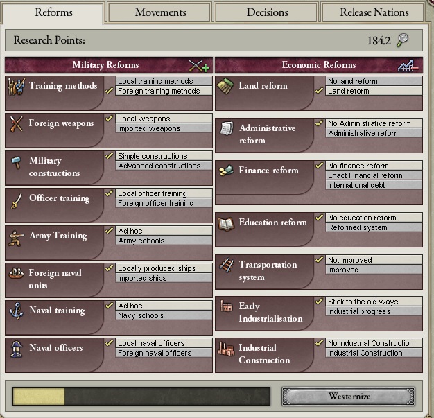 Each Reform grants a certain measure of Civilisation Progress, and once you reach 100% you may Westernise by hitting the button on the Reforms screen. Upon westernising you will receive a percentage of your Sphere-master’s techs based on the number of each type of reform you have, e.g. if you have mostly military reforms you will gain more military techs. If you are not in a SoI you gain techs based on the lowest level of techs common to all Great powers. You do not need to Westernise right away.