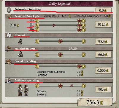 とりあえず平和時であれば陸軍海軍をそれぞれ50%未満の好きな場所くらいでいいと思います。これだけでおよそ月々200のコストカットになりますね。その他は可能な限り100%を志向しましょう。国家(プレイヤー)による建築への支払いなので建設が思うように進まなくなります