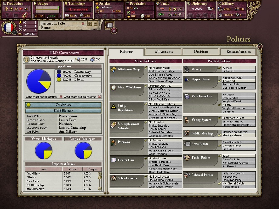 フランスの政治体制は立憲君主制です。史実ではオルレアン家が国王ですね。この立憲君主制は非常に便利で、民主政体として国民に見なされ、改革も行える上に与党はプレイヤーが選べます
