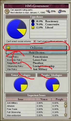 まず政党ゾーンです。上から、政体(HM's government)、上院の勢力図、政権与党(Orléaniste)とその政治的方針(Liberal)、人民と投票者の支持先(次回の選挙のざっくりとした予想)、そして人民の望む政策です