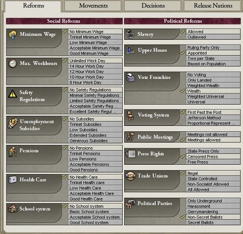 また、いくつか灰色になっている部分は政体や政権与党などの政策によってプレイヤーが関与できない(政府介入できない)ことを表しています