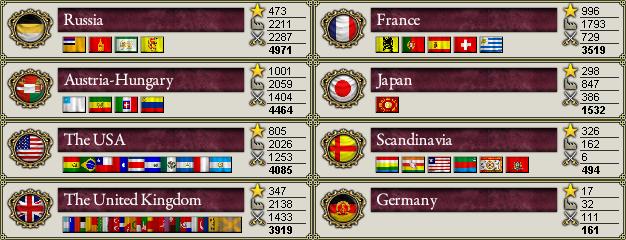米 師団数:442 艦艇数:1178 | 墺 師団数:757 艦艇数:1003 | 露 師団数:970 艦艇数:133 英 師団数:782 艦艇数:696 | 仏 師団数:502 艦艇数:868 | 日 師団数:250 艦艇数:346 米 人口:43.40M 威信点:1001 工業点:2116 軍事点:3097 | 墺 人口:25.45M 威信点:961 工業点:2474 軍事点:3933 露 人口:42.64M 威信点:535 工業点:2458 軍事点:2884 | 英 人口:70.29M 威信点:296 工業点:1495 軍事点:3441 仏 人口:30.48M 威信点:1159 工業点:1976 軍事点:1787 | 日 人口:15.89M 威信点:323 工業点:1121 軍事点:719