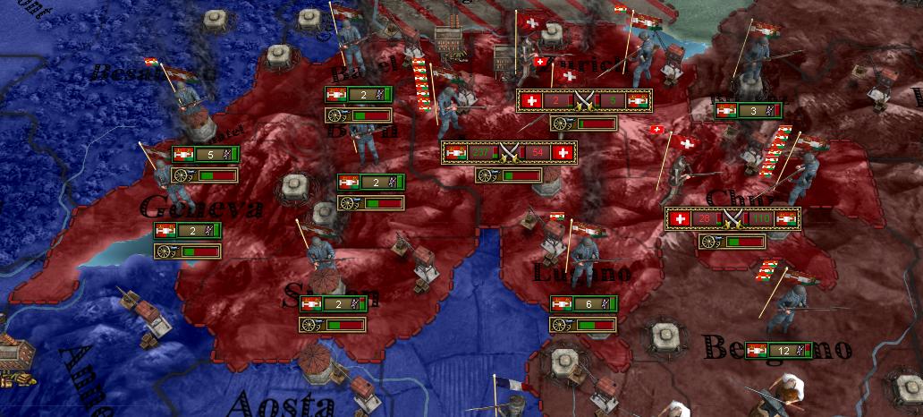 オーストリアのポイントが高いように見えるが、プレイ終了直前にスイスへ侵攻しており、軍事点が2倍になっているからだ。