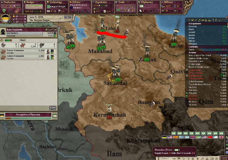 ペルシャは意外と強いので30師団近くの兵をかき集めて一気に制圧。ペルシャの西側を北から海まで3ステートを割譲。ねんがんの不凍港を手に入れたぞ。