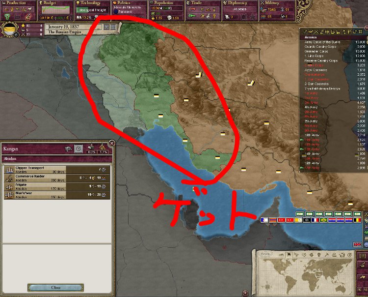 さて、ロシアはというと、ひとまずは本土人口はいいかなと。今回のプレイは史実では果たせなかったアフリカ植民に目が向いている……ロシア本土からアフリカはあまりに遠い。しかも、初期国土の港からでは戦争になった時の輸送すらままならないので、スエズ、喜望峰を迂回できる港が欲しい。そこで、ヒストリカルな展開ではあるけどペルシャへと侵攻することにした。