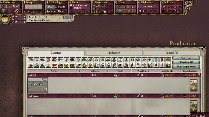 上記の通りロシアの工業化はスロペースなので高級服など工業点になる工場を建てたオーストリア、プロイセンにスコアで抜かれてランク5位に転落。しかし、今回のプレーではランクが下がるということは、宣戦が可能になるということ。プロイセン、オーストリアの背後のロシアがいつでも宣戦可能というのは両国にとっては脅威になる。そのため、工場を閉鎖してポイント下げたりもしてるみたい。だったら、最初から高級品工場建てるなと……。