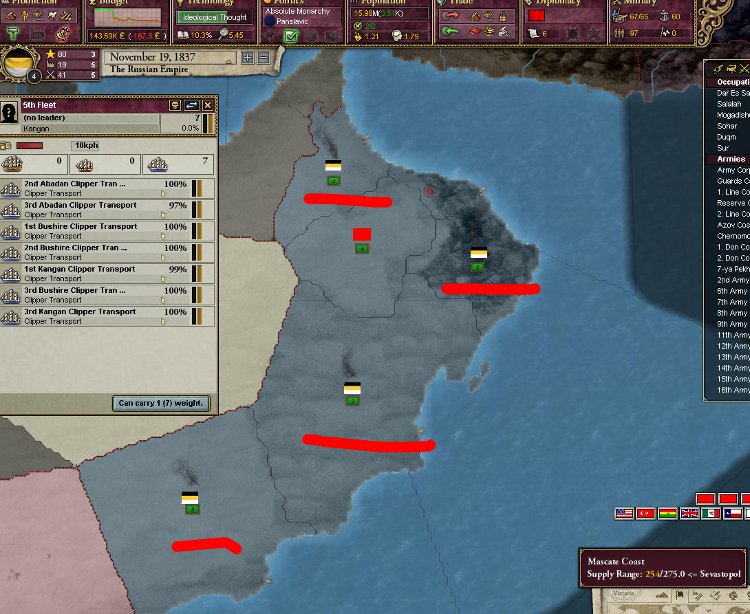 話は戻って不凍港を手に入れた次にロシアが望むのはアフリカ植民拠点の獲得だ。定番のエチオピア、ソコトは今回のプレイでは禁止なので選択肢はあまりない。どことも競合せずに植民できる拠点となるとオマーンかなと。他国に取られると話が面倒なのでペルシャの軍をオマーンに差し向けて、オマーン領アフリカを獲得。北海も地中海も通らずに植民できるコースを確保できたことは大きい。