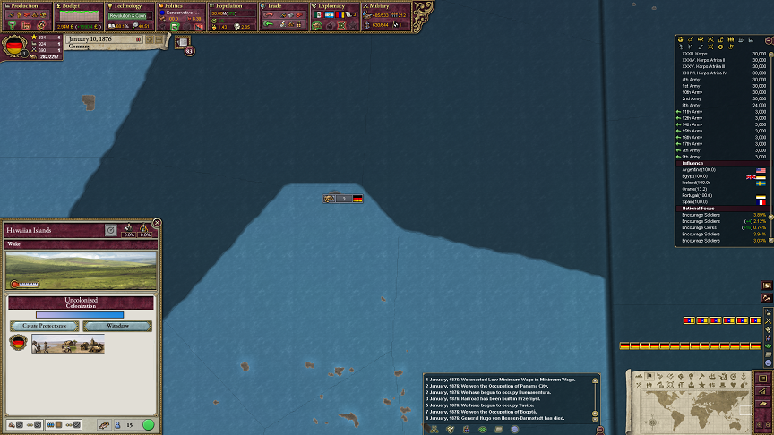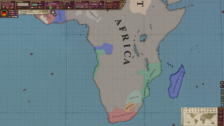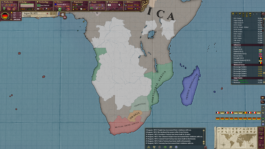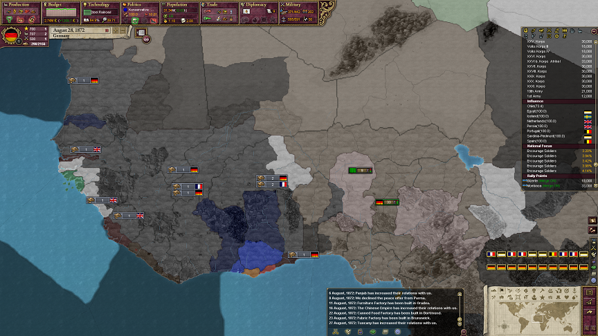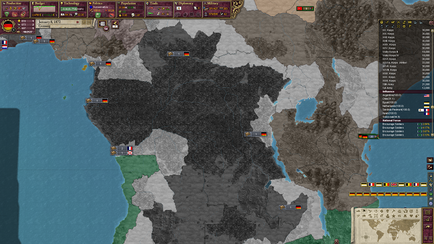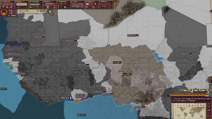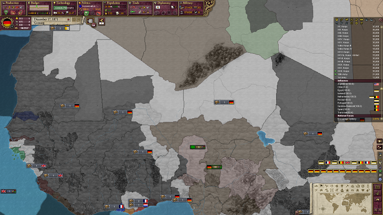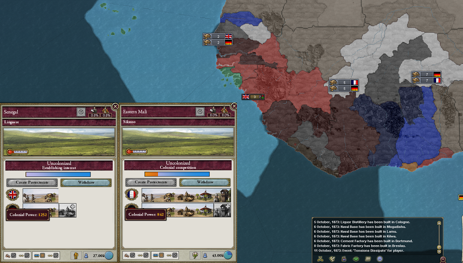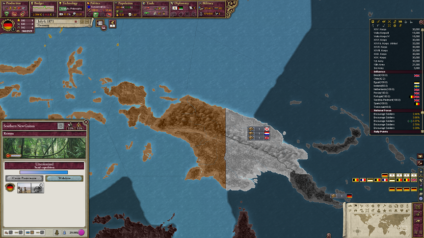 ギニア湾と東アフリカ方面、サヘル地域に植民の設定をしたよ。アジアでも、ボルネオ北部とニューギニア南東部に植民設定できた。
