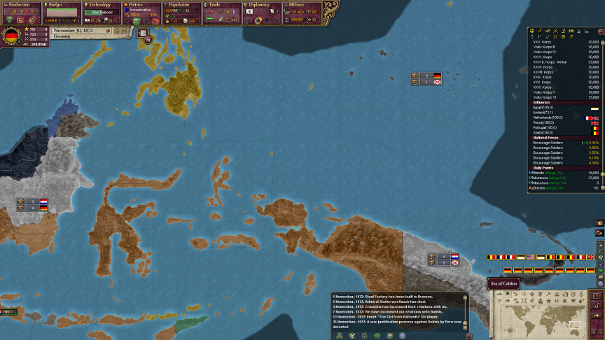 おっ、アジア方面では攻めているねー。ボルネオ島と太平洋の島にも植民できそうじゃない!