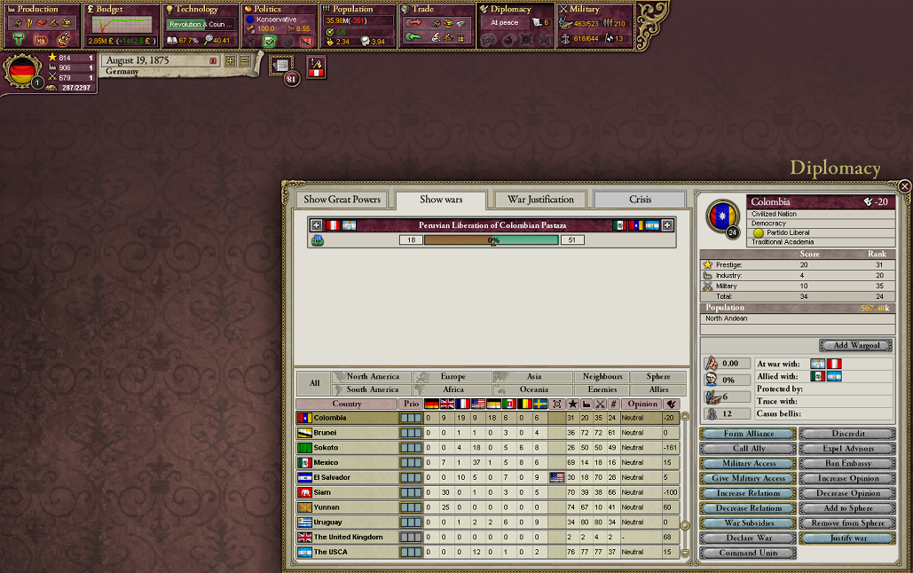 ご、ごめん。コロンビアはいまどの列強からもFriendlyになってない。こんなラッキーはないんだ。
