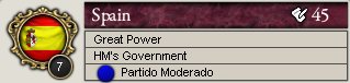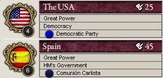 それから、立憲君主制および民主制の列強での与党第1党だが、USAとスペインで1854年に政権交代があり、USAでは民主党が、スペインではコミュニオン・カルリスタ(Comunion Carlista)という反動主義者の政党が政権与党となった。