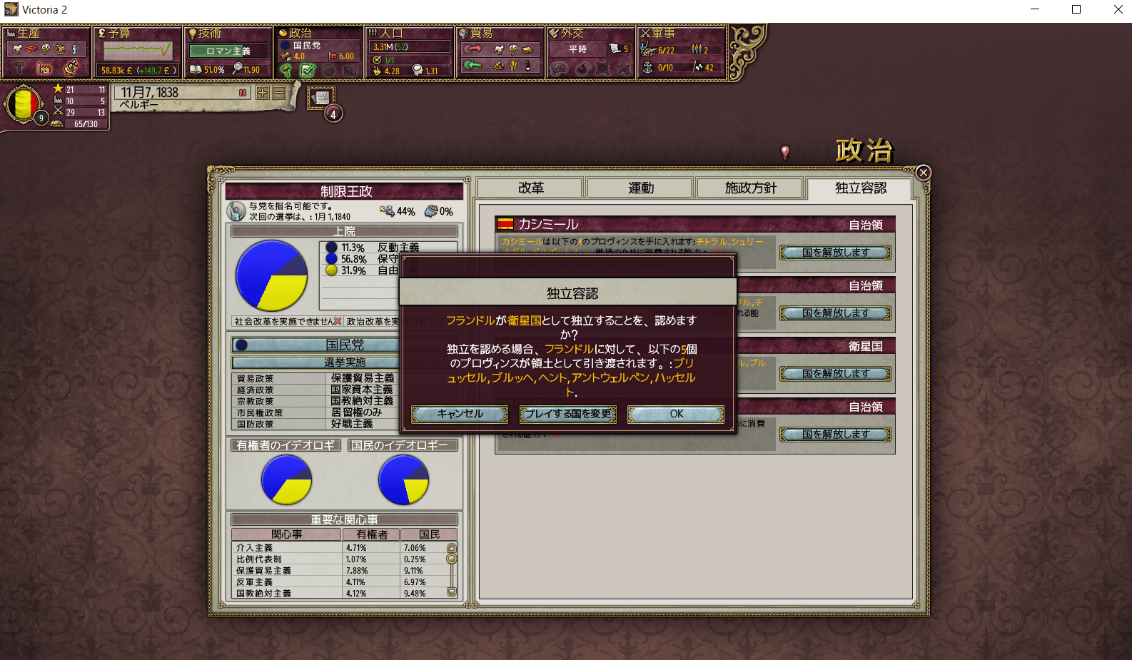 ちなみに、属国を解放すると宗主国のコアは消失しますので、この段階でベルギーのコアはブリュッセルしか残っていません。
