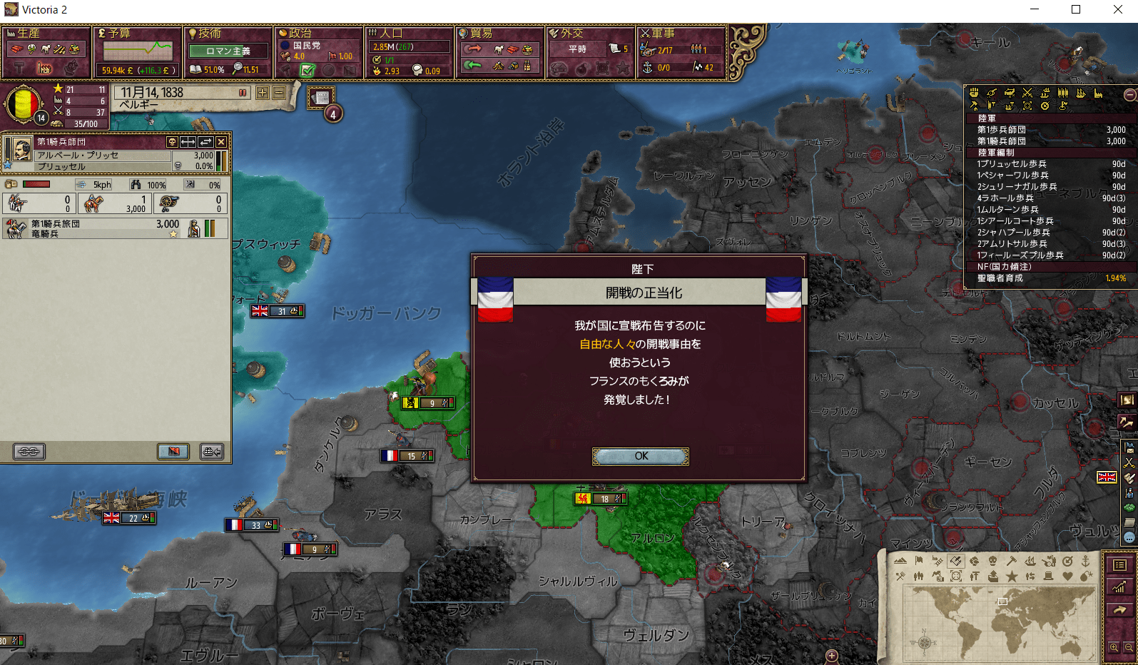 チャートとしてはベルギーで初手どこか征服、ワロニアとフランドルを解放、フランスでベルギーにCB作成→宣戦、ベルギーで即日受諾となります。